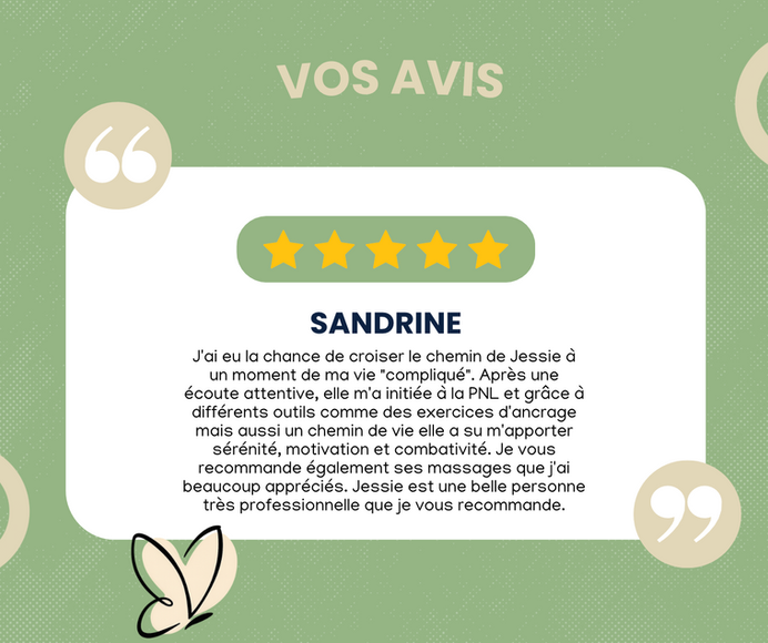 Grâce aux bienfaits de la programmation neurolinguistique, à la pratique de massages holistiques bien-être, et au coaching en bilan de compétences et de vie, j’accompagne chaque client(e) sur le chemin de sa résilience et du réalignement à Soi.